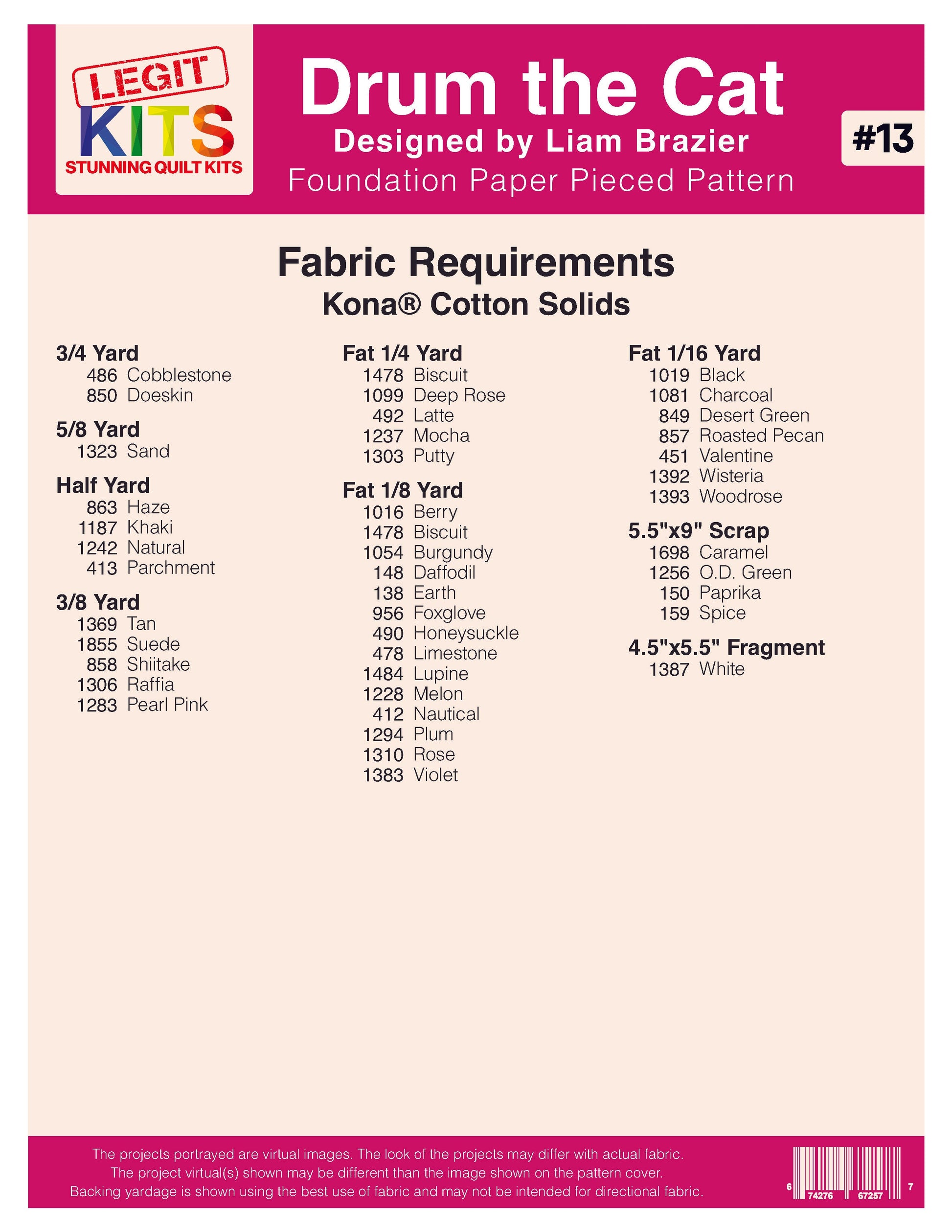 Drum the Cat is a premium design by the globally famous artist, Liam Brazier. This Legit Kits product comes with everything a foundation paper piece quilter could want.