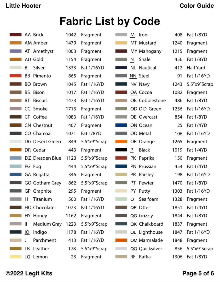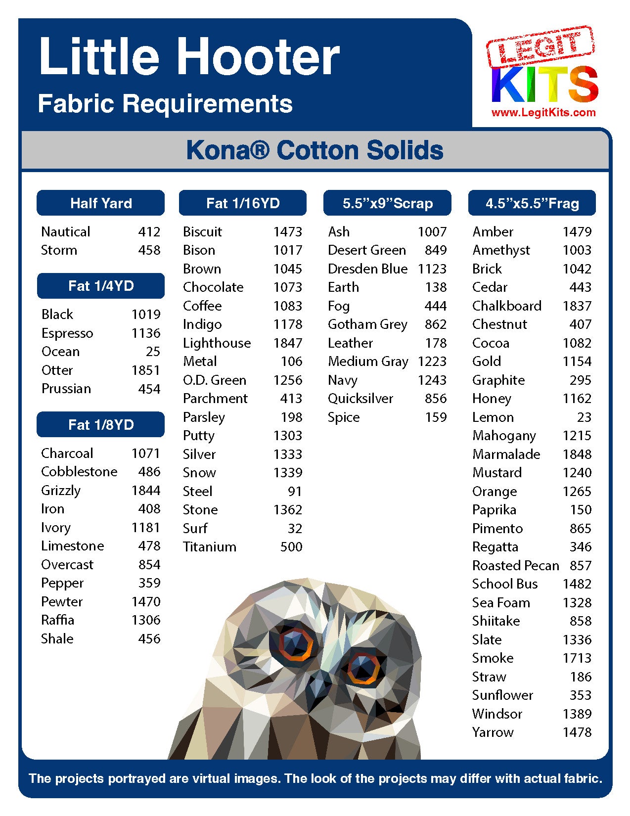 This kit contains color maps, fabric lists, an assembly guide, the full pattern printed on foundation paper, and clearly labeled, ample cuts of 75 different shades of Robert Kaufman Kona Cotton Solids to complete this medium sized, 30 inch wide by 40 inch long quilt top.