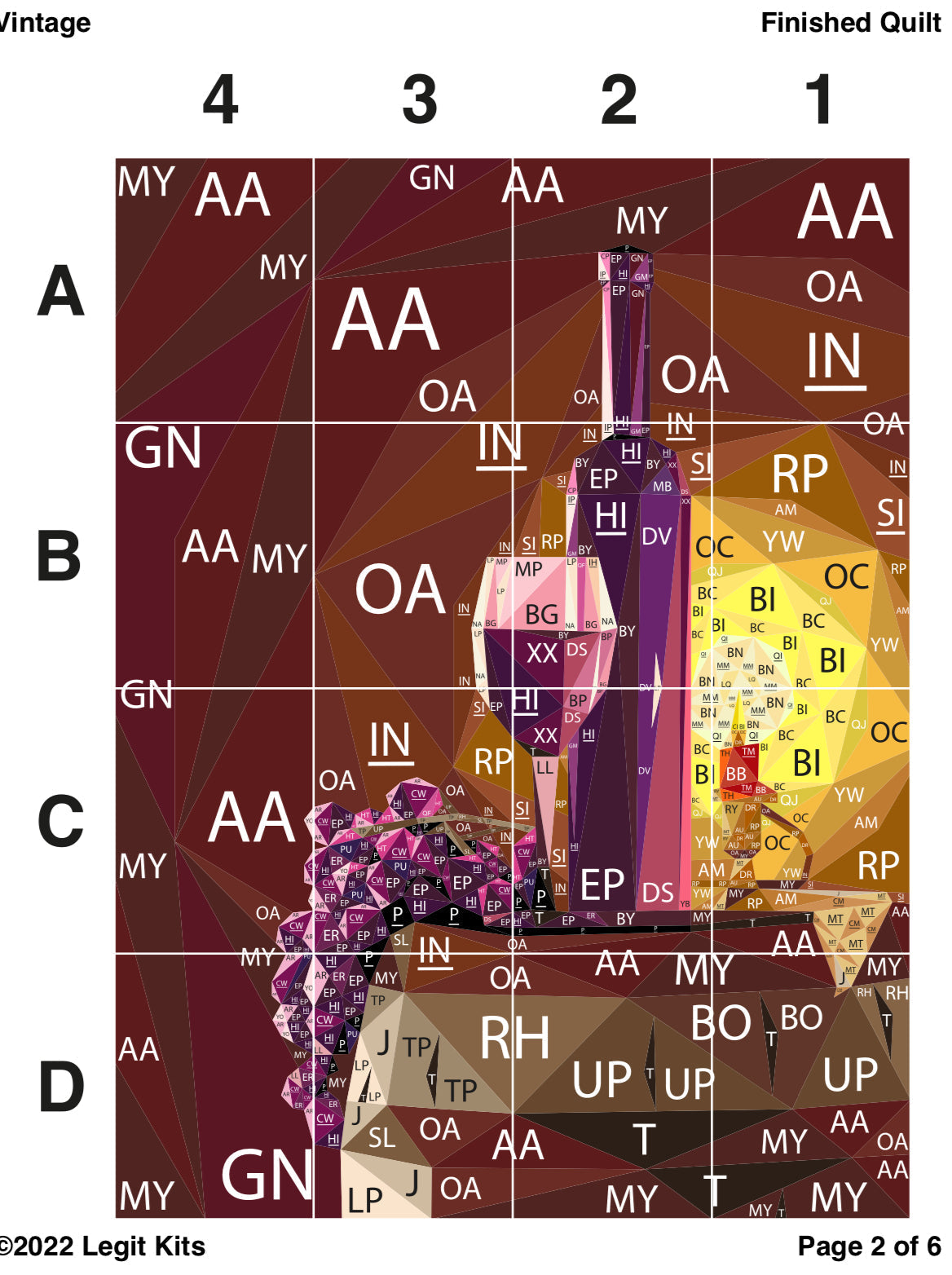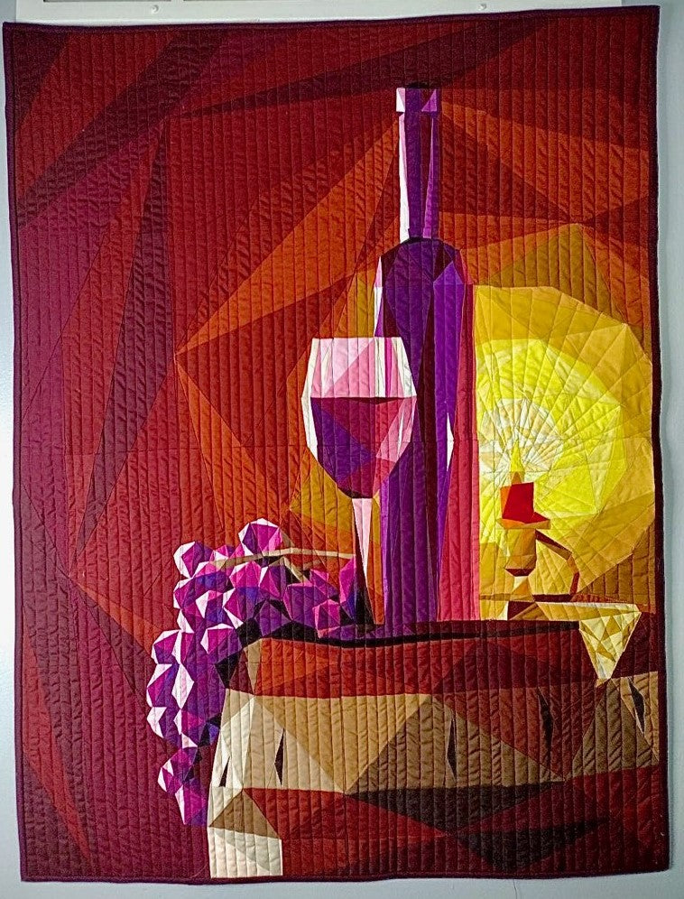 Step into the cellar and uncork the perfect bottle.  Vintage is a premium design with everything a foundation paper piece quilter could want.  Designed with lush purples and warm browns, this quilt top kit will make a fabulous wall hanging art piece, baby quilt, or surround this design with complimentary fabric to create a stunning full sized quilt top.  This kit contains color maps, fabric lists, an assembly guide, the full pattern printed on foundation paper, and clearly labeled, ample cuts of 59 different shades of Robert Kaufman Kona Cotton Solids to complete this medium sized, 30 inch wide by 40 inch long quilt top.